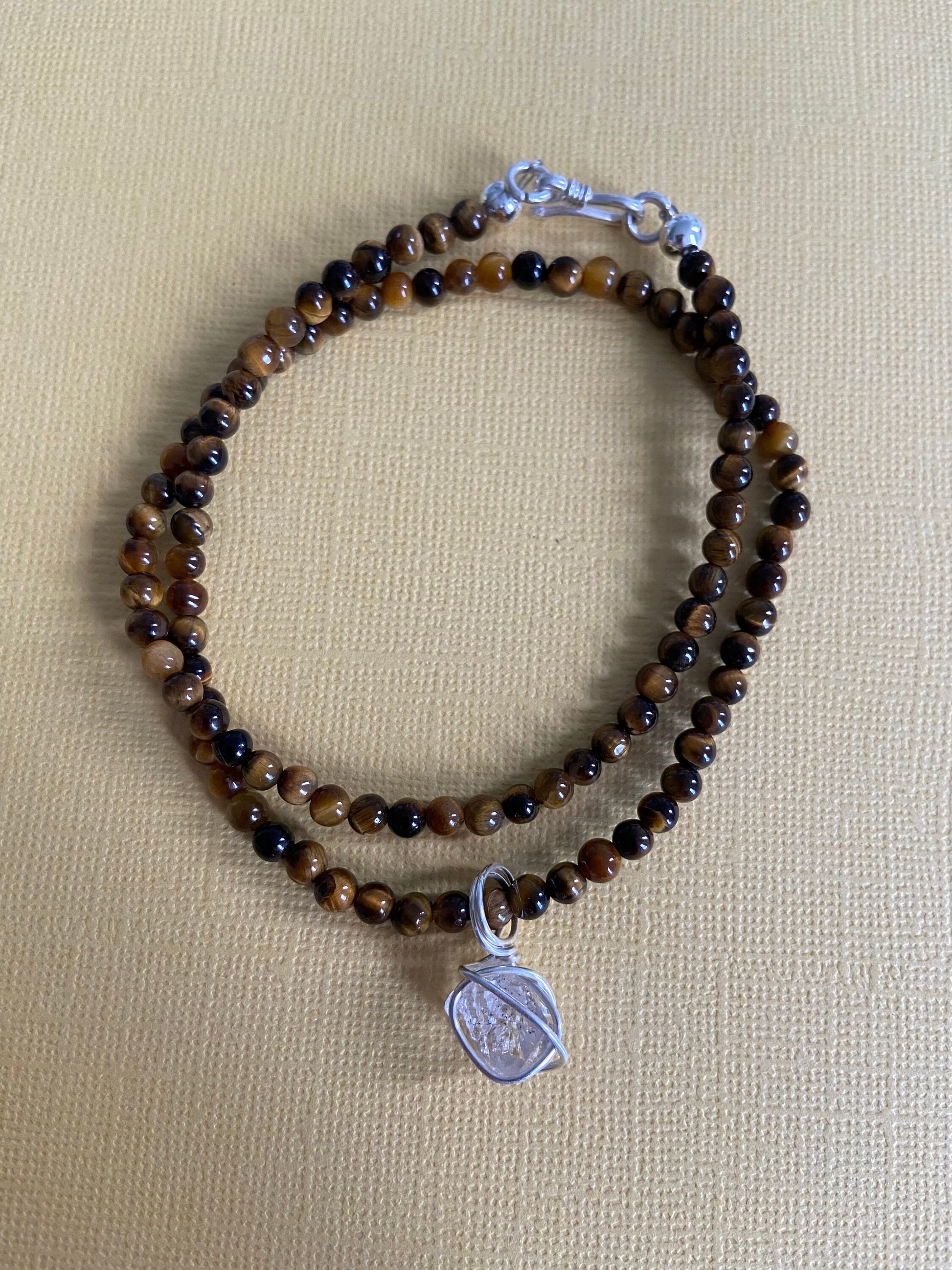 Herkimer diamond crystal wrapped in solid sterling silver in friendship with a natural tigers eye gemstone beaded necklace.