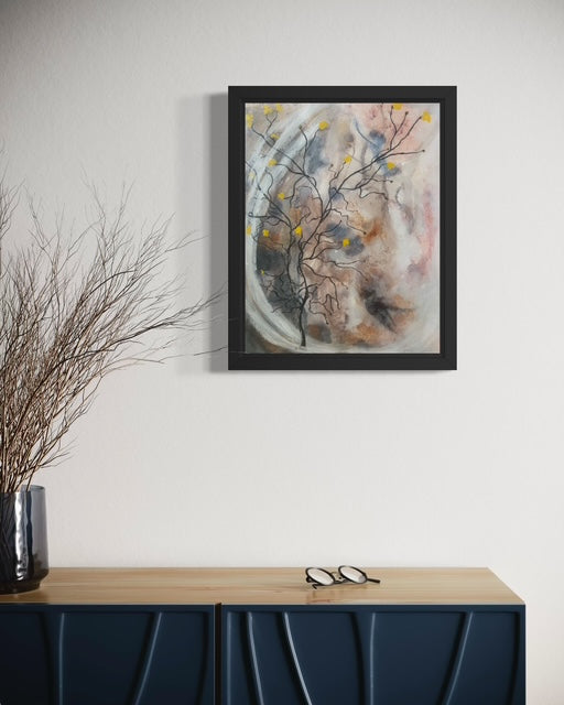 A delicate tree reaches upward with fine, flowing branches, each tipped with soft golden blossoms. Set against a dreamy, atmospheric backdrop of warm ochres, misty greys, and gentle blush tones, the scene feels like nature emerging through morning fog. The sweeping white arc adds a sense of quiet movement, as if a soft breeze is passing through. This piece blends abstraction with organic form to create a feeling of calm, renewal, and quiet resilience—perfect for bringing a serene, earthy elegance into any space.